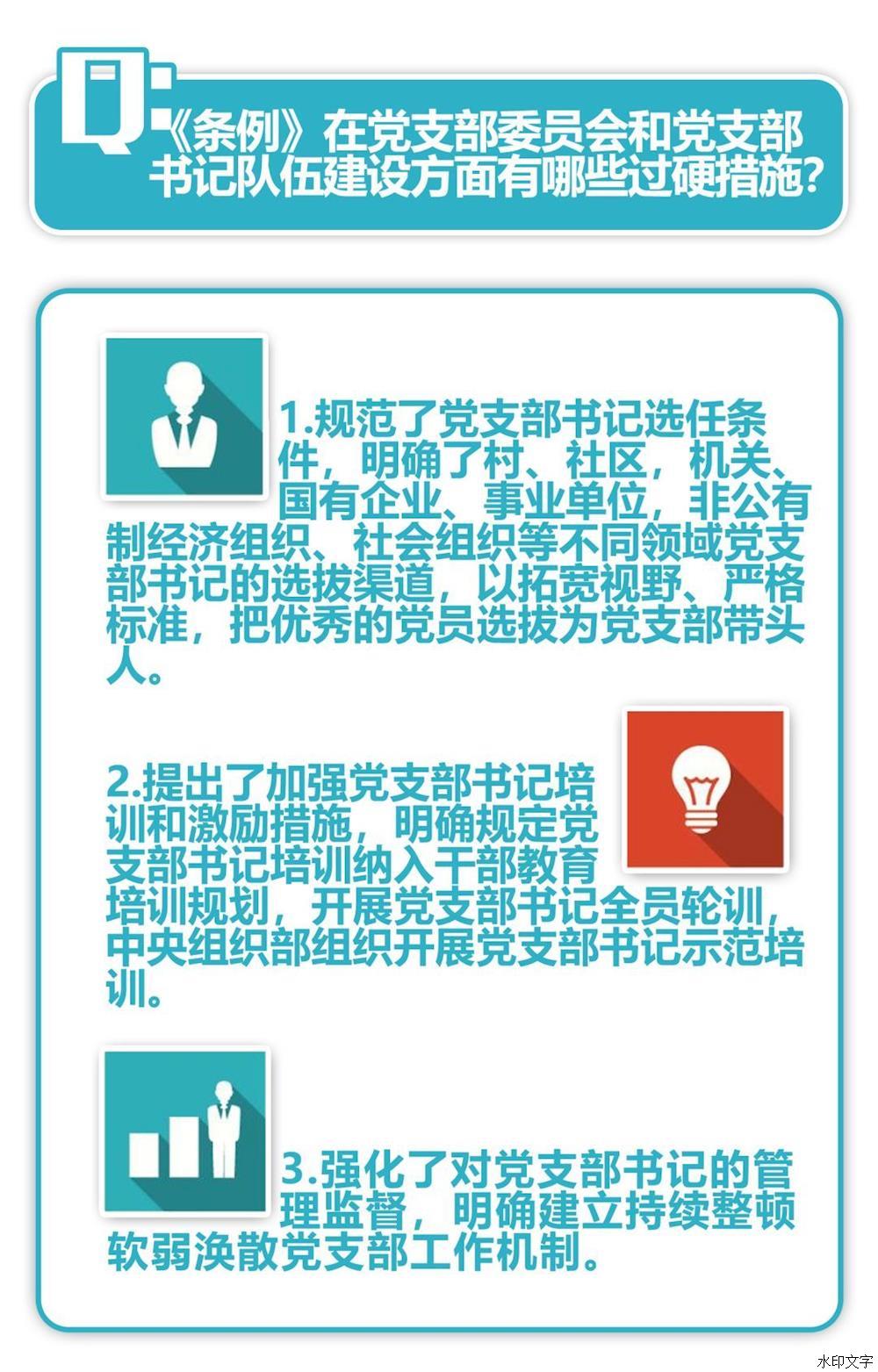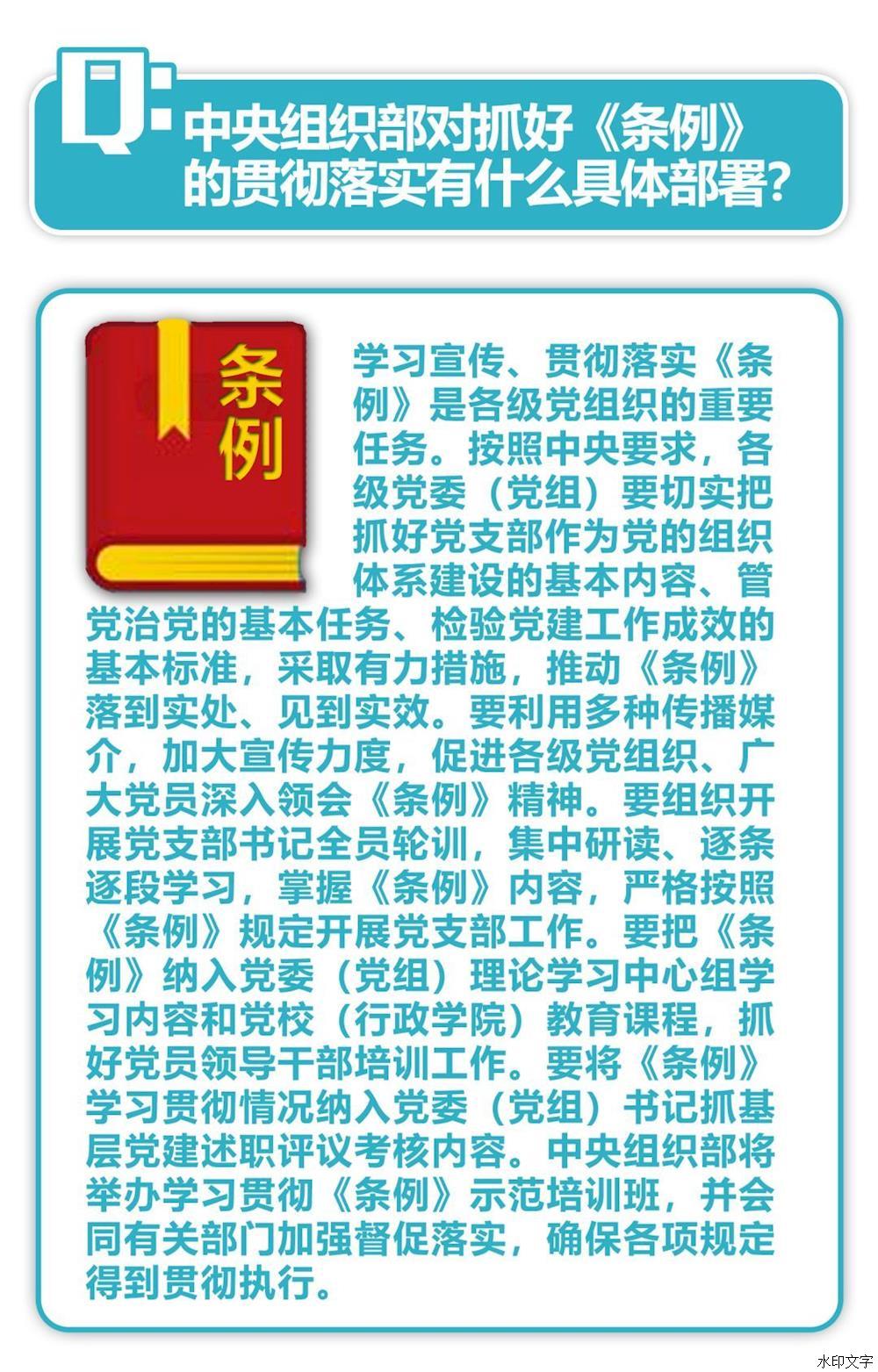 通知強調(diào),重視黨支部、善抓黨支部,是黨員領導干部政治成熟的重要標志。各級黨委(黨組)要牢固樹立政治意識、大局意識、核心意識、看齊意識,切實把抓好黨支部作為黨的組織體系建設的基本內(nèi)容、管黨治黨的基本任務、檢驗黨建工作成效的基本標準,采取有力措施,推動《條例》落到實處、見到實效。要抓好《條例》的學習宣傳和貫徹落實,利用報紙、廣播、電視和手機、網(wǎng)絡等媒介,通過專題研討、集中培訓等方式,使各級黨組織、廣大黨員特別是黨支部書記深入領會《條例》精神,全面掌握《條例》內(nèi)容,切實增強貫徹執(zhí)行《條例》的思想自覺和行動自覺。要加強對黨員領導干部的培訓,把《條例》納入黨委(黨組)理論學習中心組學習內(nèi)容和黨校(行政學院)教育課程,提高各級領導班子抓好黨支部工作、推動黨支部建設的本領。要加強監(jiān)督檢查,對貫徹落實《條例》不力的嚴肅追責問責。中央組織部要會同有關部門加強督促落實,確保各項規(guī)定得到貫徹執(zhí)行。