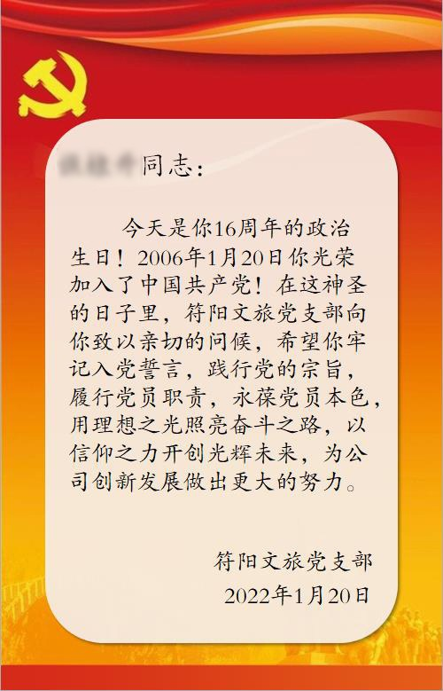 支部在核準(zhǔn)每一名黨員入黨時間的基礎(chǔ)上,按照黨員入黨日期建立黨員“政治生日”臺賬,每逢黨員“政治生日”當(dāng)天,黨支部將在黨員微信群發(fā)一張電子賀卡,讓黨員充分感受到組織的關(guān)懷與溫暖,從而將思想認(rèn)同轉(zhuǎn)化為牢記初心、堅定信仰的前進動力,努力為公司的創(chuàng)新發(fā)展做出更大貢獻(xiàn)!