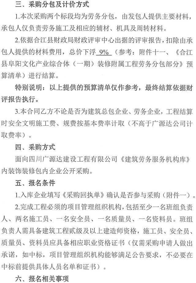 采購公告:四川廣源達(dá)建設(shè)工程有限公司阜陽文化產(chǎn)業(yè)綜合體(一期)裝修附屬工程勞務(wù)分包企業(yè)采購公告(第二次)