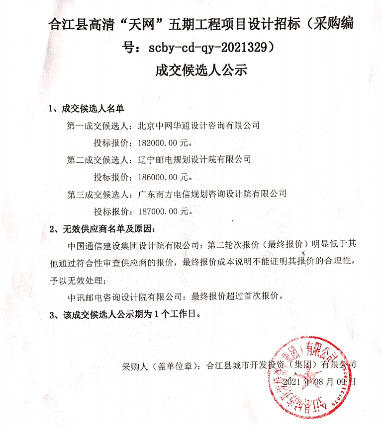 合江縣高清“天網(wǎng)”五期工程項目設(shè)計招標成交候選人公示
