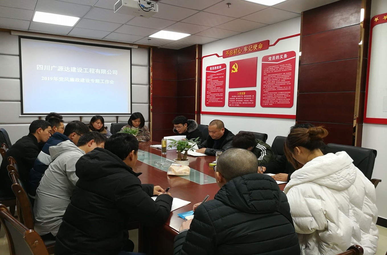 1月11日下午,四川廣源達建設(shè)工程有限公司組織召開了2019年第一季度安全生產(chǎn)工作暨黨風(fēng)廉政建設(shè)工作會議。會上,董事長譙棣升領(lǐng)學(xué)了安全生產(chǎn)工作相關(guān)文件,全面總結(jié)了2018年安全生產(chǎn)工作目標完成情況,并對2019年公司的安全生產(chǎn)工作提出了要求。同時,董事長譙棣升還著重強調(diào)了廉潔從業(yè)相關(guān)事宜,要求抓黨風(fēng)廉政建設(shè)要像抓企業(yè)安全生產(chǎn)一樣持之以恒,與企業(yè)經(jīng)營發(fā)展同頻共振;把廉潔從業(yè)作為企業(yè)發(fā)展的出發(fā)點,堅持以廉潔凝聚人心,以廉潔樹立形象。