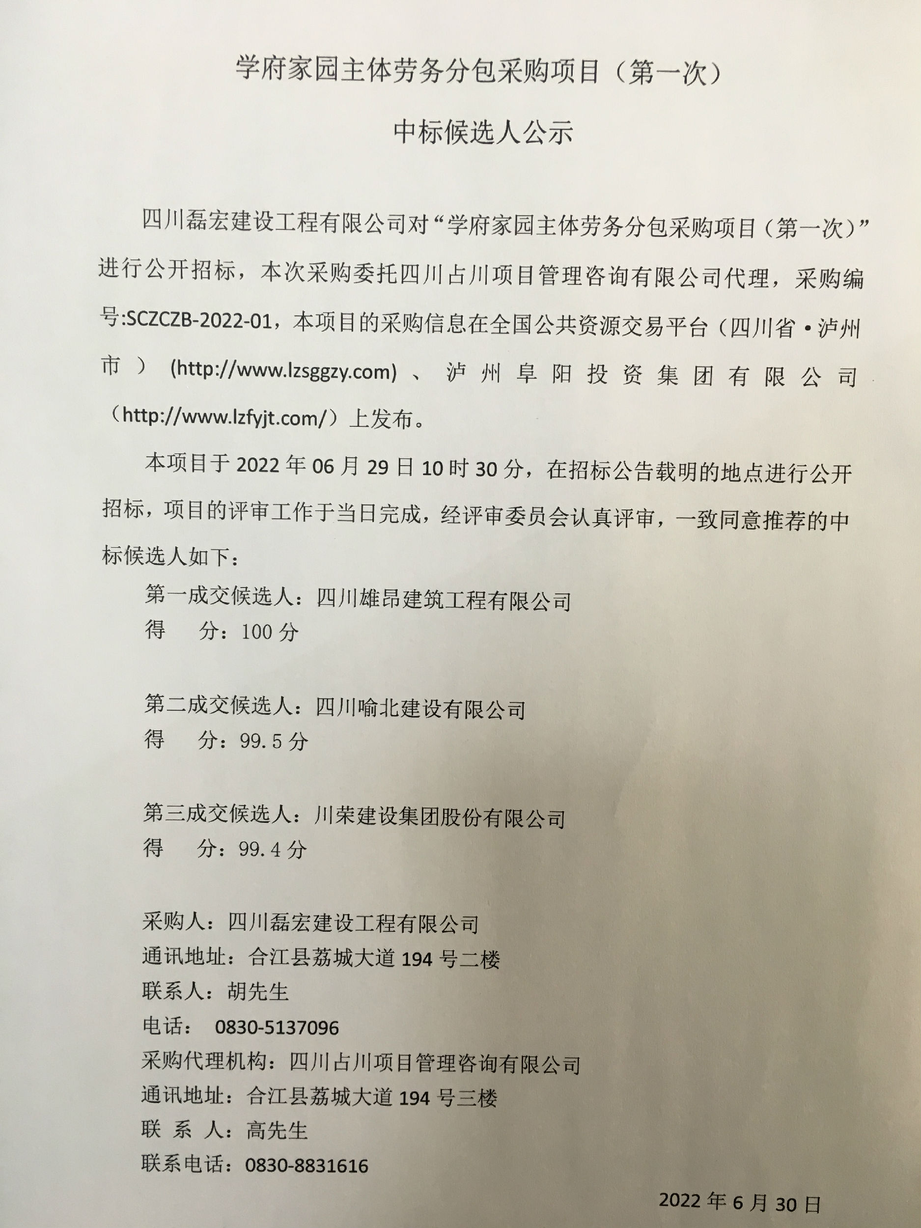 學(xué)府家園主體勞務(wù)分包采購項目(第一次)中標(biāo)候選人公示